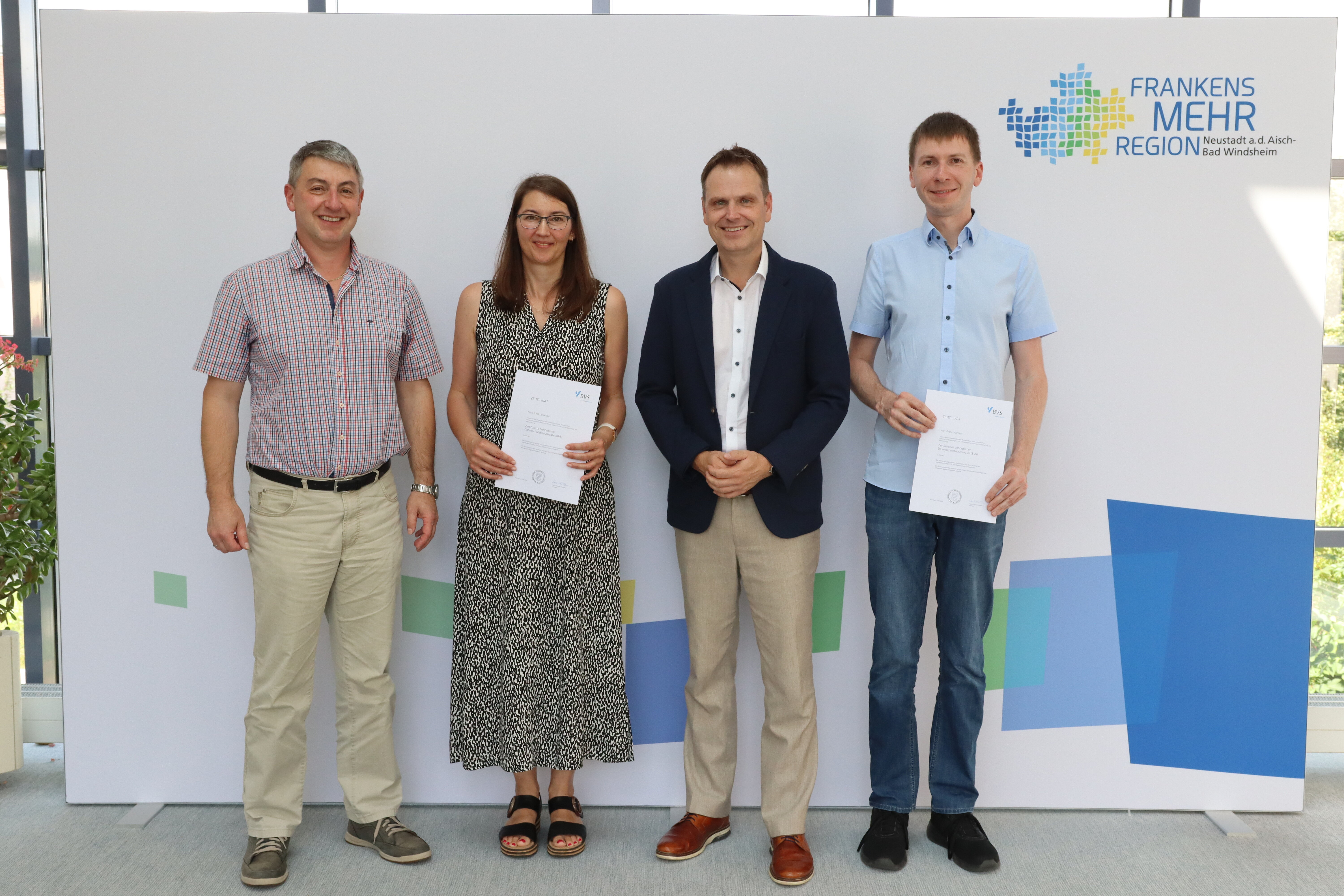 Die Bayerische Verwaltungsschule bietet seit Kurzem in Zusammenarbeit mit dem Bayerischen Landesbeauftragten für den Datenschutz den Zertifikatslehrgang zum/zur „Zertifizierten Behördlichen Datenschutzbeauftragten (BVS)“ an. Ilona Lakatosch und Frank Härtlein vom Sachgebiet Kreisrechnungsprüfung/Datenschutz haben nun den Lehrgang erfolgreich absolviert. Bislang wurde dieser Lehrgang erst von fünf Teilnehmern in ganz Bayern abgeschlossen. Die Zertifikate wurden den beiden Mitarbeitern des Landratsamtes in München von dem Bayerischen Landesbeauftragten für den Datenschutz, Prof. Dr. Thomas Petri, persönlich überreicht.