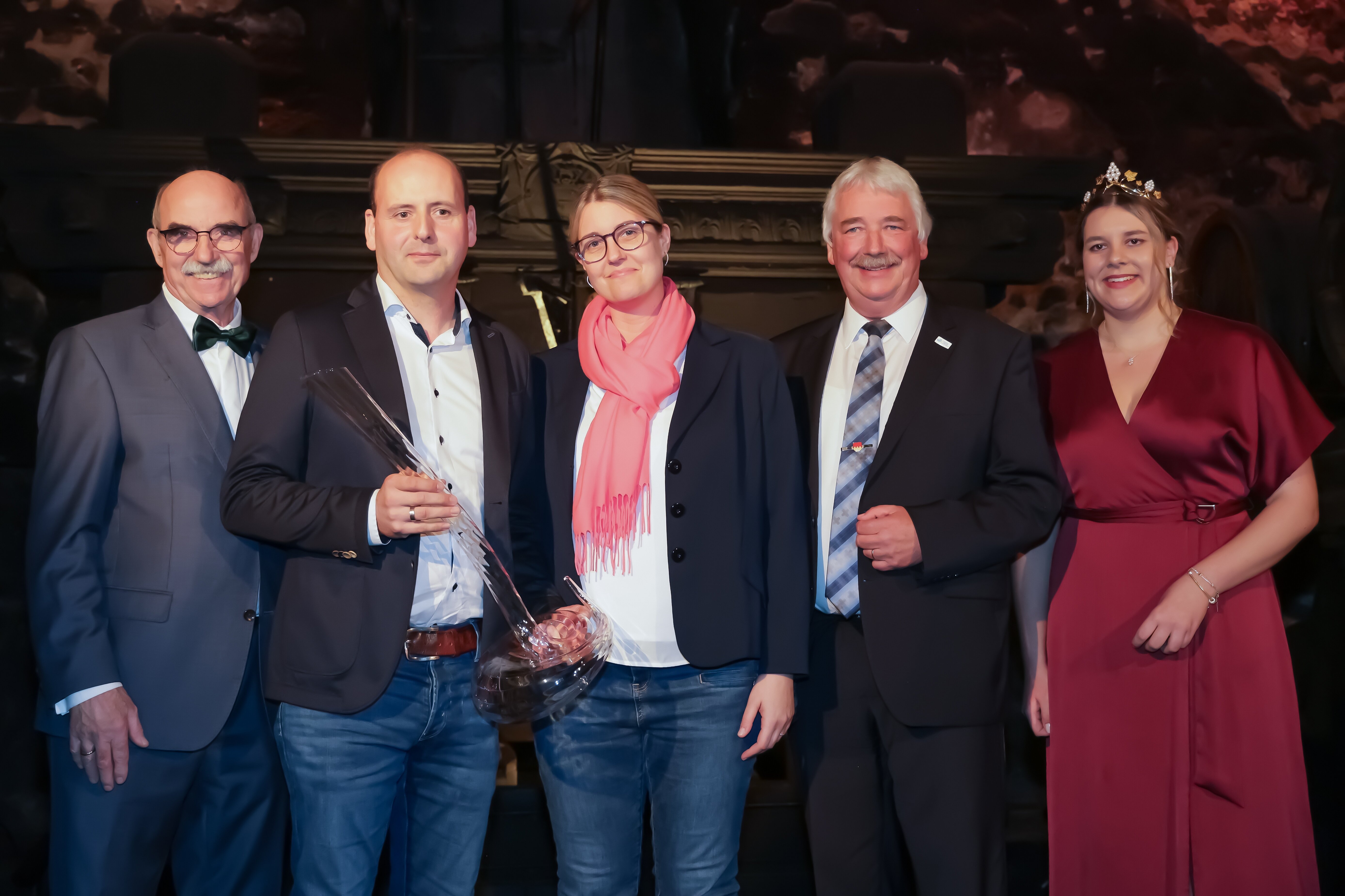 Im Rahmen einer feierlichen Gala wurden nun die Preise überreicht. Das Weingut Düll, Ipsheim, durfte sich über den Ehrenpreis des Landkreises freuen, der ihnen von stellvertretendem Landrat Reinhard Streng übergeben wurde. Der Preis dafür wird jährlich individuell ausgesucht – das Weingut Düll erhielt einen außergewöhnlichen Weindekanter.