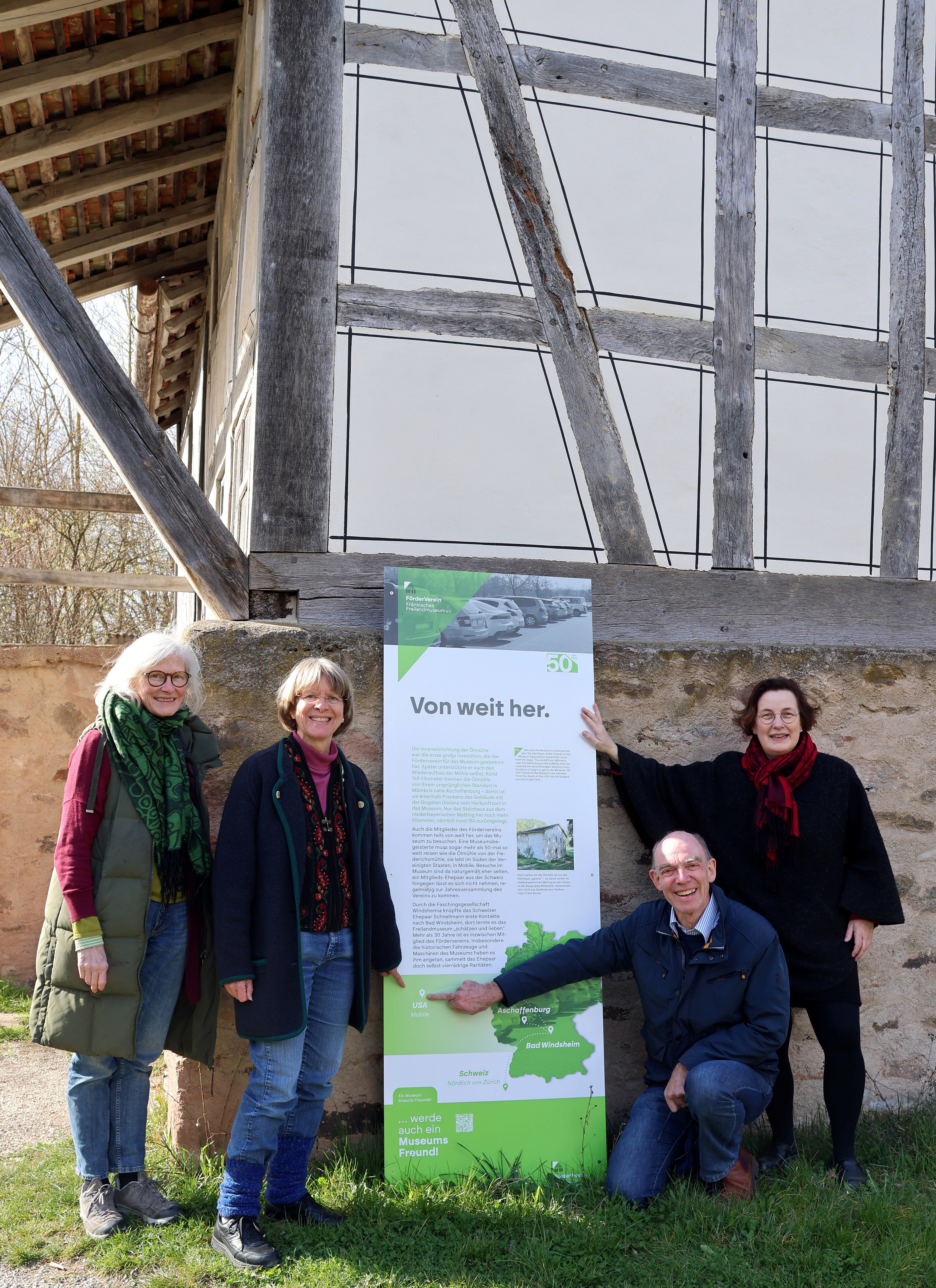 Victoria Swank (Zweite von links) mit (von rechts) Museumsleiterin Dr. Karin Falkenberg, Ul- rich Herz und Friederike Enser an der Ölmühle des Freilandmuseums. Ihre weite Anreise zum Museum hat der Amerikanerin Victoria Swank in der Geländeausstellung anlässlich des 50. Jubiläums des Fördervereins eine Erwähnung eingebracht, die entsprechende Ausstel- lungstafel steht an der Ölmühle. Foto: Christine Berger