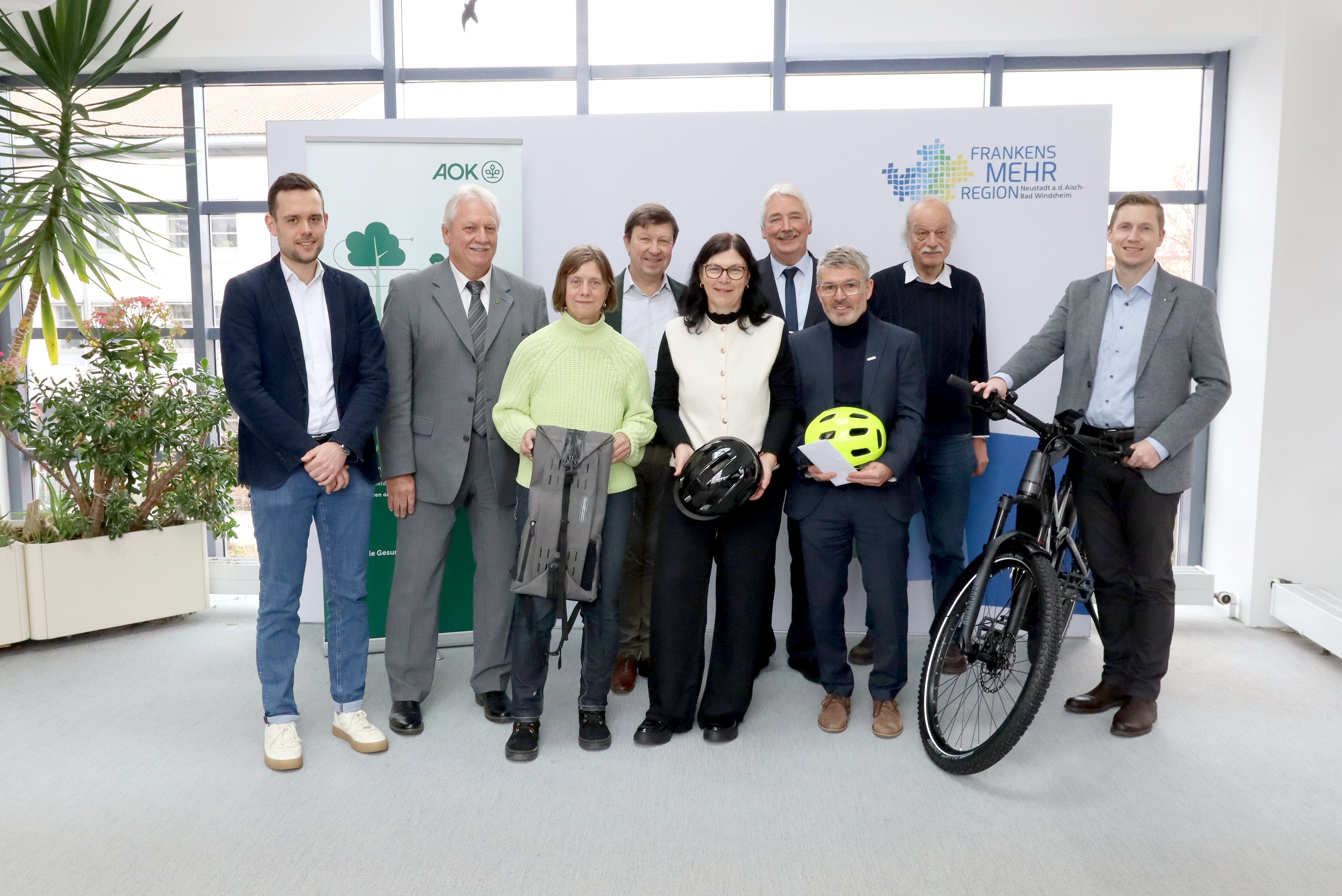 v.l. Jean-Philippe Desiles, von der vbw Bezirksgruppe Mittelfranken, Klaus Meier, Bürgermeister der Stadt Neustadt, Gewinnerin Margit Sonnenleiter, Jürgen Heckel, Bürgermeister der Stadt Bad Windsheim, Gewinnerin Birgit Schäff, Reinhard Streng, stv. Landrat in Neustadt a.d.Aisch-Bad Windsheim, Gewinner Alexander Wülk, Frank Wessel vom ADFC und Michael Surowka, Direktor der AOK in Mittelfranken freuten sich über den erfolgreichen Abschluss „Mit dem Rad zur Arbeit“ 2025