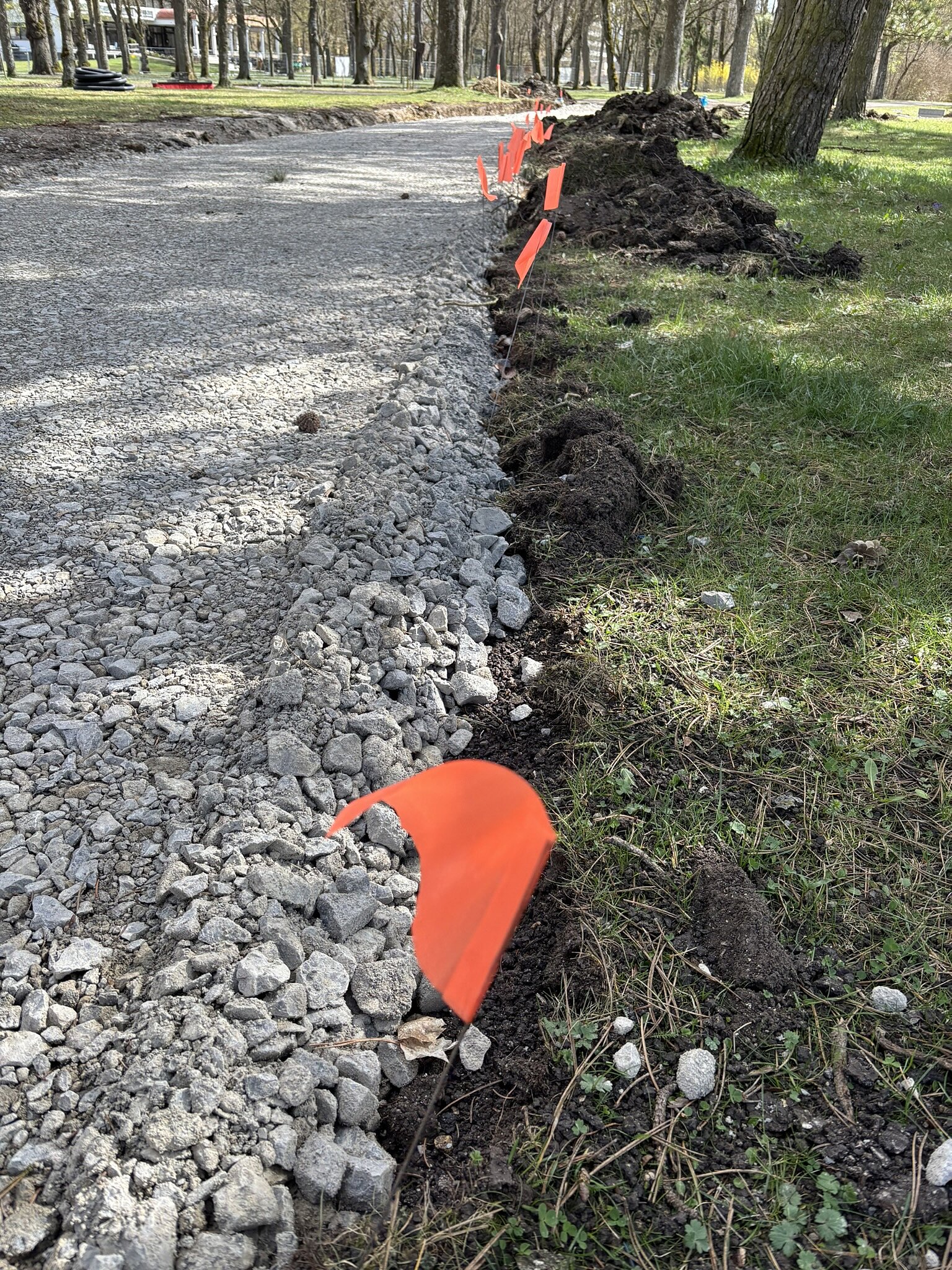 Fähnchen zur Wurzelmarkierung neben neuer Tragschicht (Bild: Bayerische Landesgartenschau Bad Windsheim 2027 GmbH)