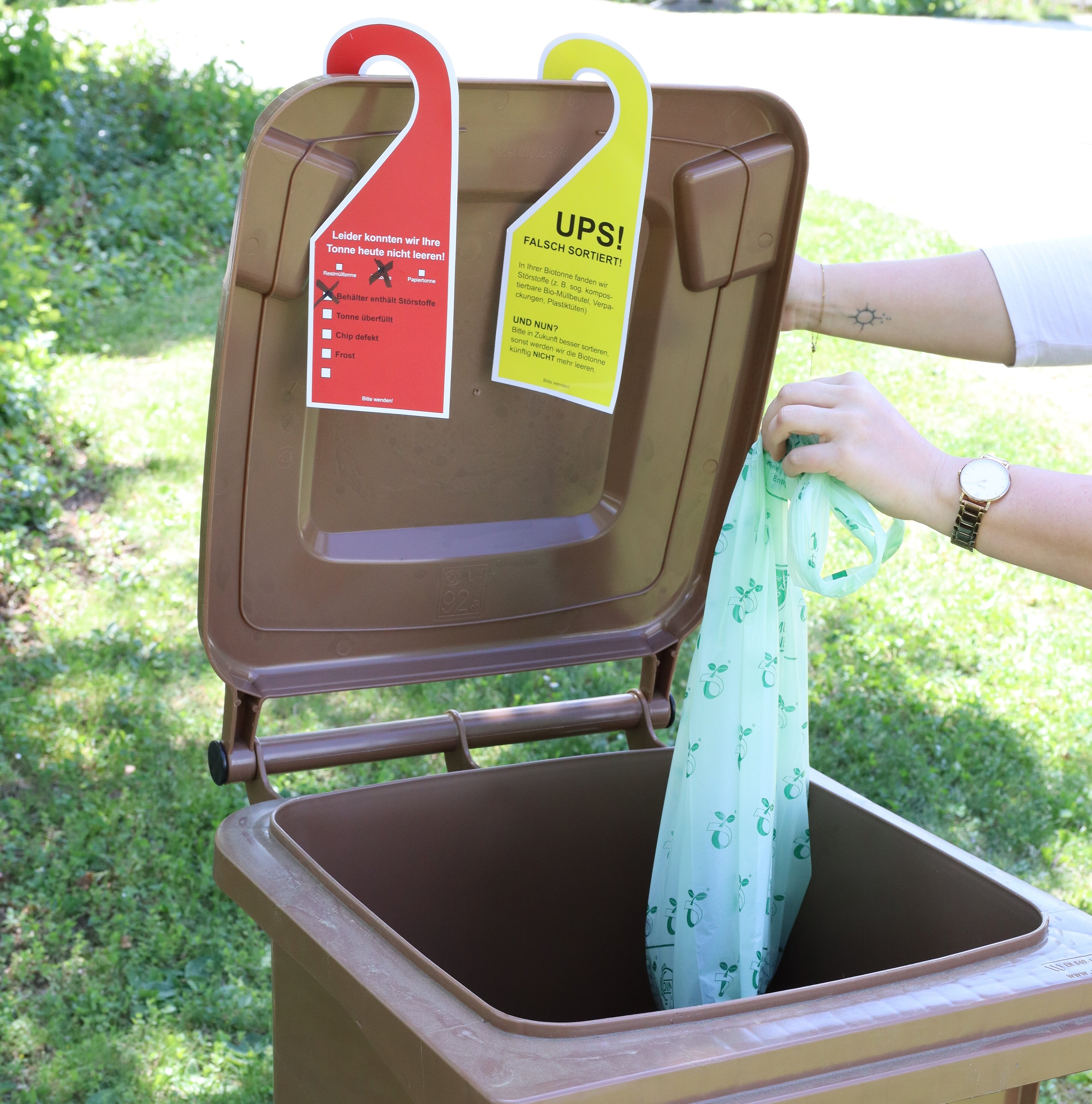Wie läuft so eine Kontrolle ab? Vor der Leerung sichtet der Lader den Inhalt der Tonne auf Materialien, die nicht hineingehören und dokumentiert diese mit Fotos. Die Zuordnung von Bildern, Tonne und Eigentümer erfolgt dabei über einen Chip, der am Behälter angebracht ist. Wurden Störstoffe gefunden, bekommen in der ersten Woche nicht richtig befüllte Biotonnen einen gelben Anhänger, der auf die falsche Befüllung hinweist. Bei vertretbaren Fehlwürfen wird das Gefäß dennoch letztmalig geleert. Ab der zweiten Woche werden falsch befüllte Biotonnen nicht mehr geleert. Diese müssen dann vom Nutzer selbst nachsortiert werden. Begleitend dazu kommt ein roter Anhänger zum Einsatz, der erklärt, aus welchen Gründen die Tonne nicht abgefahren werden konnte.