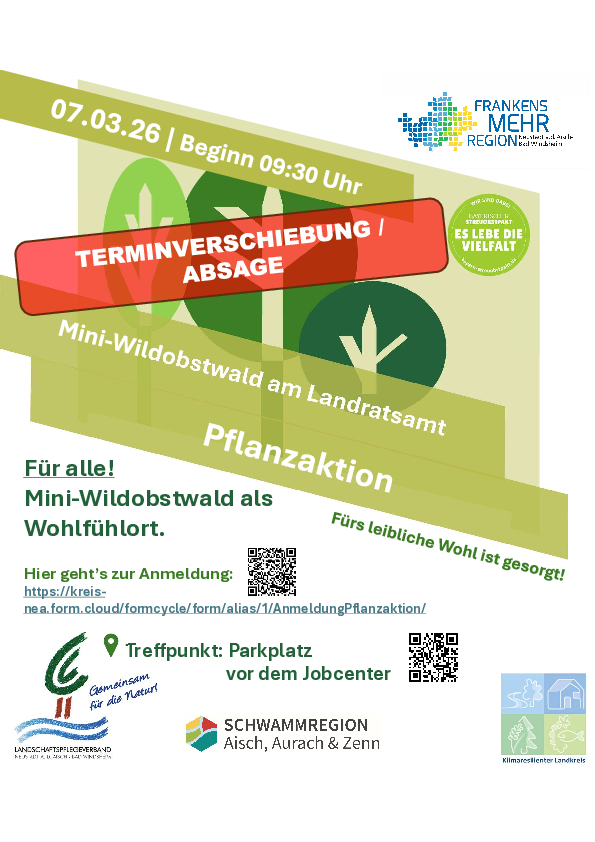 Aufgrund der aktuellen Witterungsbedingungen (Vernässung des Bodens), müssen wir den naturpädagogischen Pflanzaktionstag des geplanten Mini-Wäldchens am Jobcenter leider verschieben. Wir bitten die Umstände zu entschuldigen und werden den neuen Termin baldmöglichst bekanntgeben.